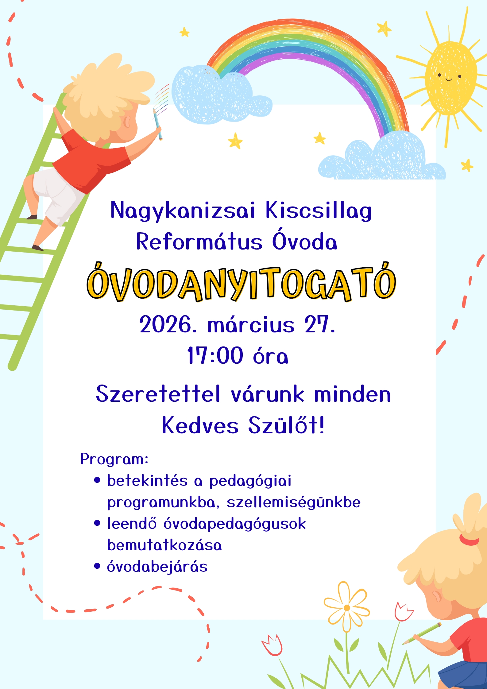 Óvodanyitogató2026.03.18./0 Hozzászólás/Kategória: Hírek/Szerző: kiscsillag Kedves Szülők! Szeretettel várunk minden érdeklődőt a bemutatkozó alkalmunkon. https://reformatusovi.hu/wp-content/uploads/2026/03/Blue-and-Yellow-Bright-Fun-Welcome-to-Kindergarten-Poster_20260316_130607_0000.jpg 2245 1587 kiscsillag https://reformatusovi.hu/wp-content/uploads/2025/06/logo_blue.png kiscsillag2026-03-18 11:54:362026-04-08 12:15:30Óvodanyitogató